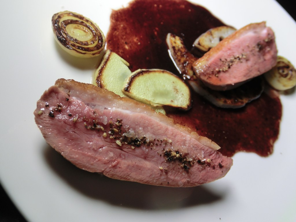 また、京鴨などの合鴨を用いる場合でも、鴨感(?;鴨らしさ。です)を強く打ち出したければ、テフロン加工された調理パンを用いてポワレをすると、表面温度が低くなり香りが飛ばなくなります。また、ソースに鴨の溶け出した脂を使用すれば、かなり鴨の香りを補うことができます。