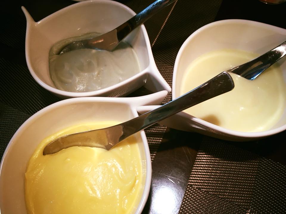 右上のものから時計まわりに、「キタアカリ(粉質ジャガイモ)」「インカのめざめ(粘質ジャガイモ)」「キタアカリ(デンプン糊化ver.)」のピューレとなっています。