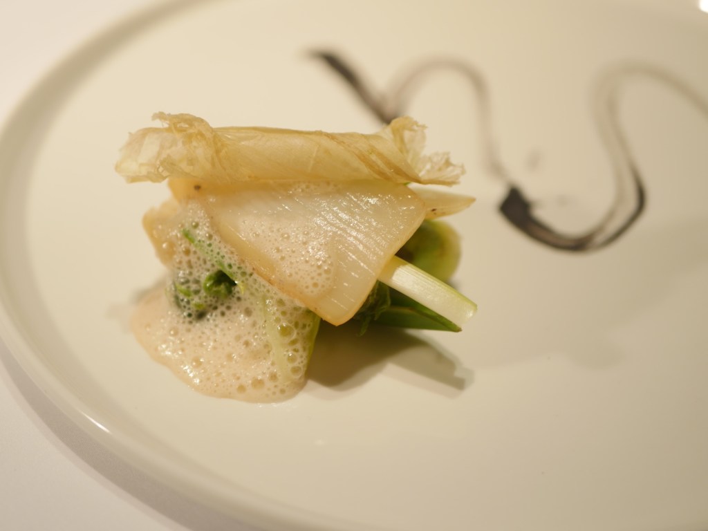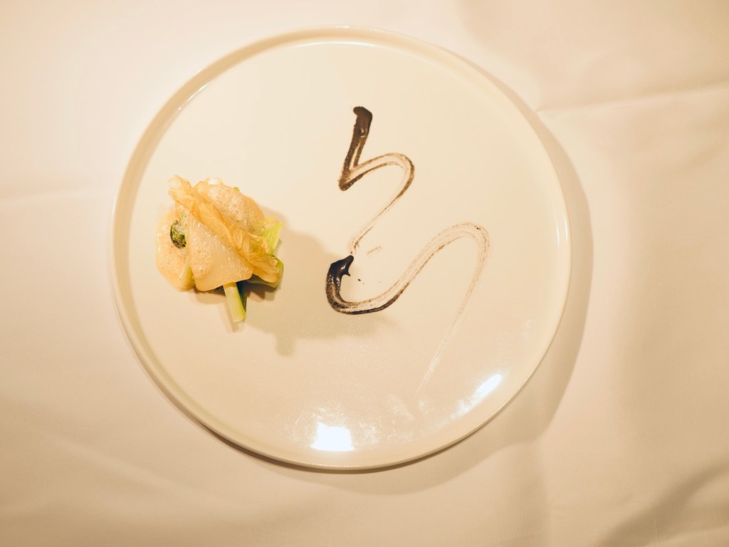 イカゲソはオーブンで香ばしく焼いて、鶏出汁や野菜出汁を加えて、バターとともにソースへ